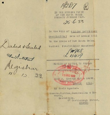 William MacGillivray died in 1933 aged 67. His estate was worth over 11,000 pounds. There was a galvanised iron museum and wire netting enclosures and scientific collections (worth 250 pounds) at his home in Chloride Street. The detailed valuations of William MacGillivray’s general practice and the debts owed to the practice provide insight to a country doctor’s life.
