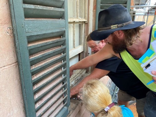 The scaffolds are up, allowing the team to look closely at windows and roofs. The arcade and main house verandah roof sheets have been carefully repaired in situ and coated with oil, and broken slates and lead flashings replaced on the main house. Desalination (removal of salts) has been completed in areas of rising damp, and joinery on the main house and stables has been removed and repaired.