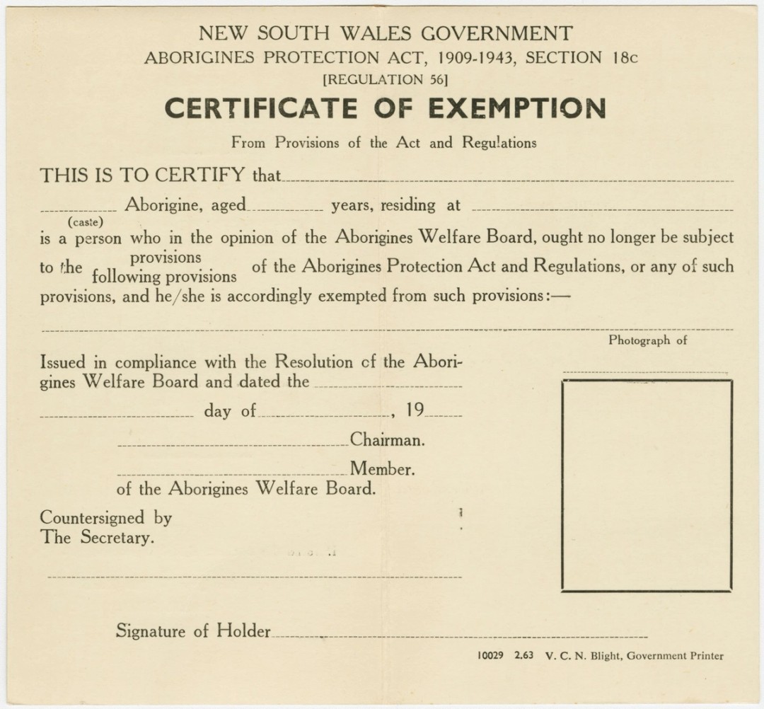The 1943 amendment to the Act restructured this system, renaming the Board the Aborigines Welfare Board and granting it new corporate powers, including the right to buy and sell land, issue exemption certificates, and determine who was subject to the Act (Aborigines Protection (Amendment) Act 1943, sections 3A, 3B and 4B). These certificates of exemption stripped people of their Aboriginal identity while overtly fracturing communities through bureaucratic erasure.