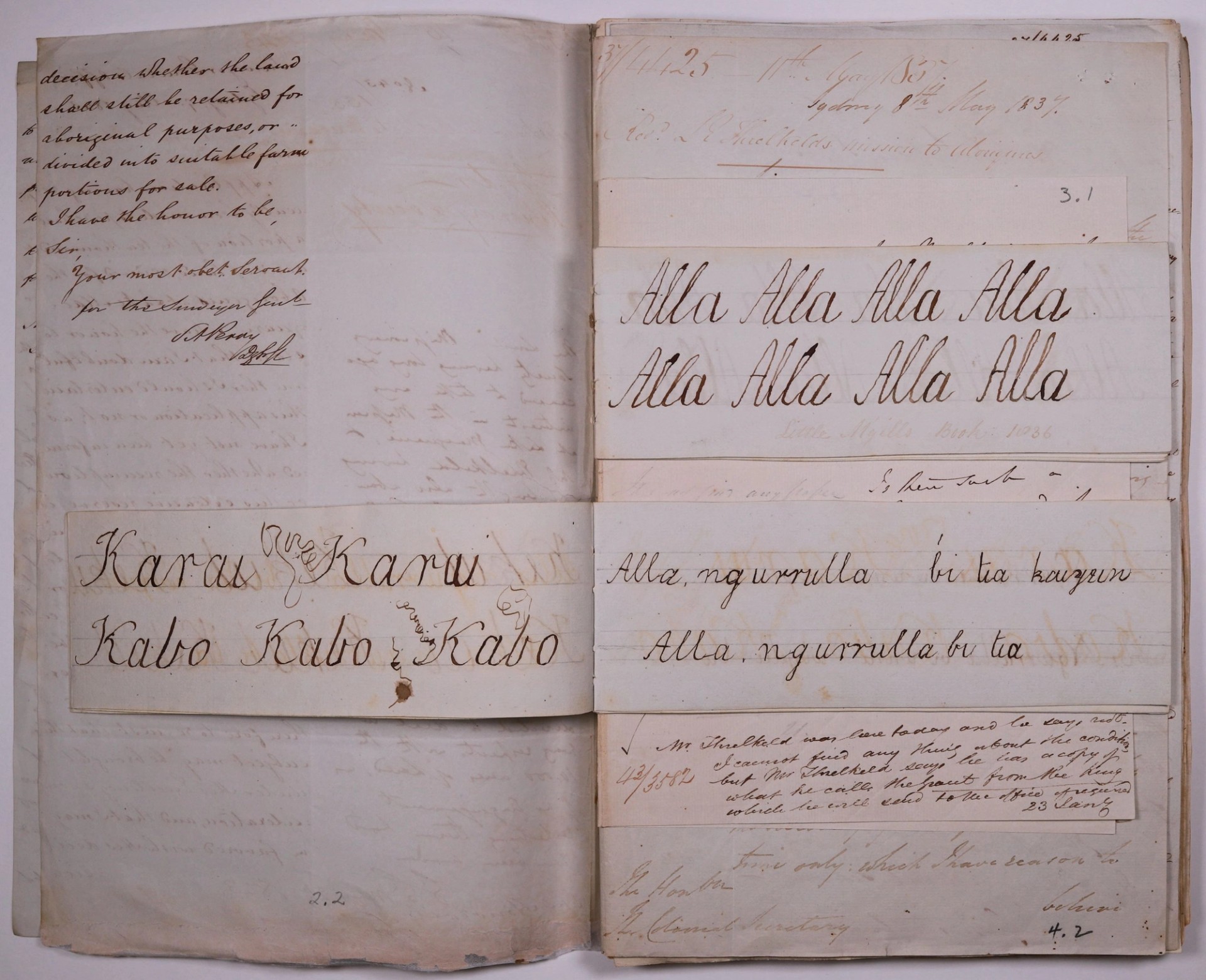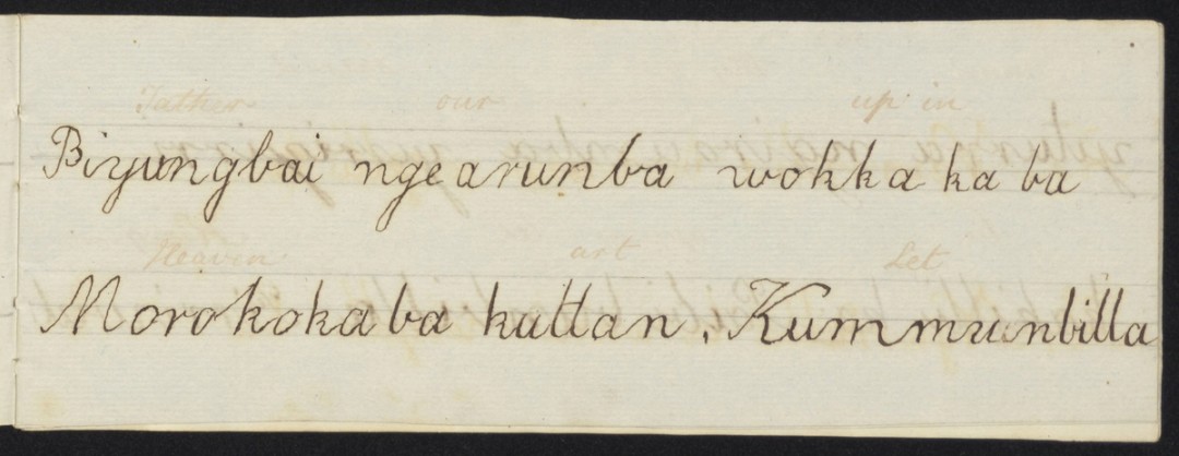 Uncovered in our page turn were two student copybooks handwritten in Awabakal. The cover of one book was inscribed with ‘Little M’gill’, and the other with ‘Billy Blue’s book 1836’. A transcription of the 1836 Annual Report of the Mission to the Aborigines at Lake Macquarie notes that Threlkeld had begun teaching two young Aboriginal students to read and write verses of the Bible in their own language.