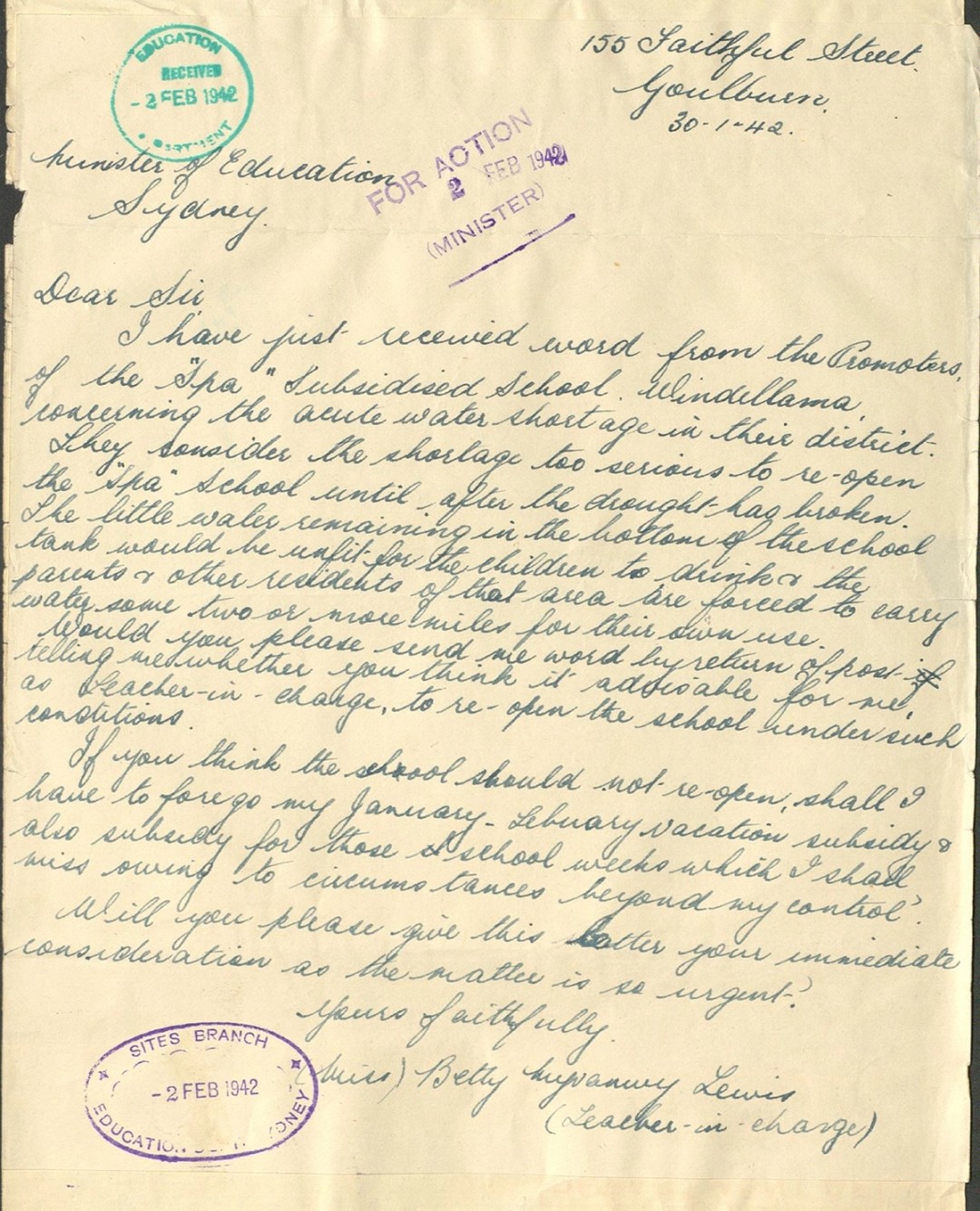 The Spa’s inaugural teacher was Miss Lewis, a local resident from the Goulburn area who taught the children of Windellama from 1941 to 1942. On 31 January 1942, Miss Lewis wrote a letter to the Chief Inspector at the Department of Education seeking permission to suspend the commencement of school. The reason: a shortage of water at The Spa.6 Mrs Hush also wrote a letter to the Chief Inspector confirming this information.7 In the summer of 1941–42, NSW experienced what the Bureau of Meteorology refers to as ‘the World War II drought’, a period of intense dryness across the eastern seaboard of Australia.8 While the school was closed, Miss Lewis temporarily taught at Bourke Street Infants School in Goulburn, pending instruction. In February 1942, Windellama experienced decent rainfall, enabling the reopening of the subsidised school.