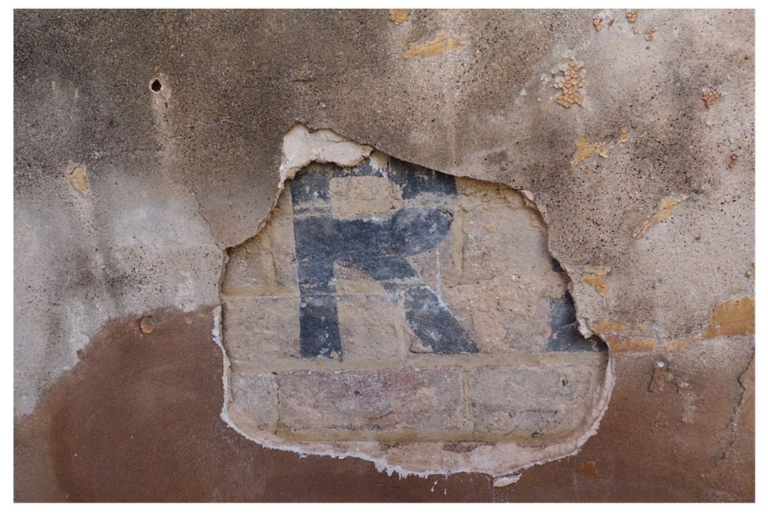 Work on regrouting the sections of failed render on the splay wall of the corner shop revealed the letter ‘R’ perfectly preserved below one section of render. Conservators were engaged to determine how best to protect the powdery black paint (possibly distemper, a handmade paint with a slightly uneven finish) lettering before new render was applied.