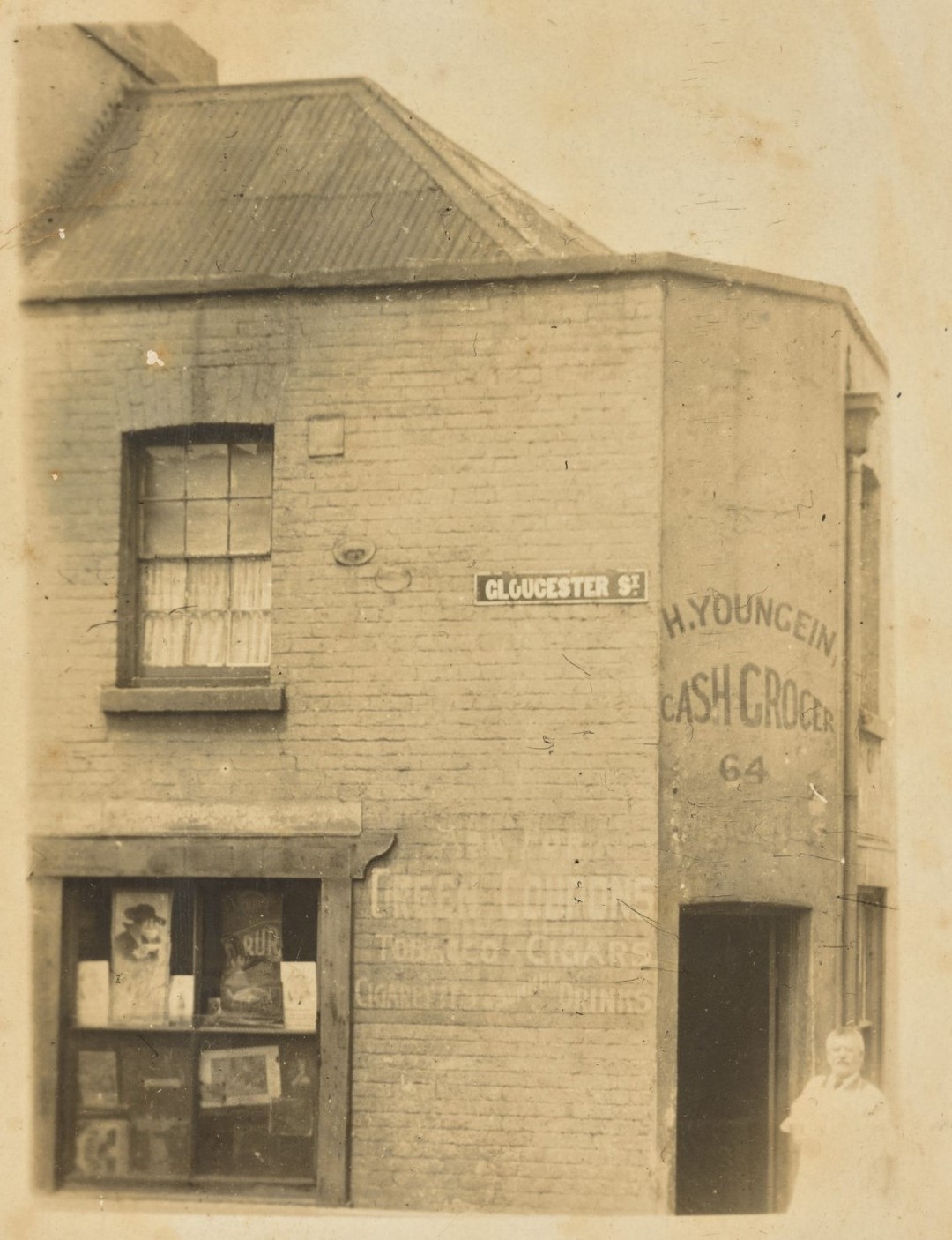 From 1903, Hugo Youngein was living in number 64 and running the business, his name proudly painted above the doorway to the shop. On the Gloucester Street facade, more painted signage lists some of the goods available in his shop: tobacco, cigars and ‘summer drinks’. It also invites people to ‘ask for green coupons’ – an early-20th-century customer loyalty scheme.