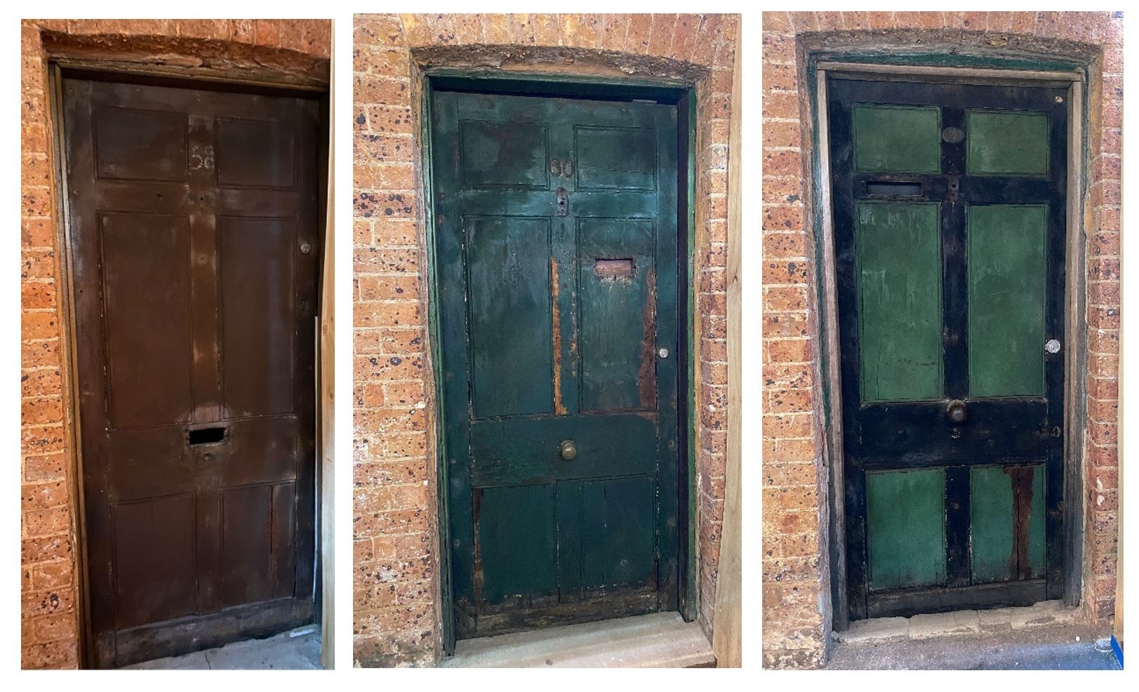 To weatherproof the original 1840s doors, new painted masonite sheeting was attached, together with the existing fittings, including house numbers and doorknobs. View 3D scans of the doors in the interactive models below.