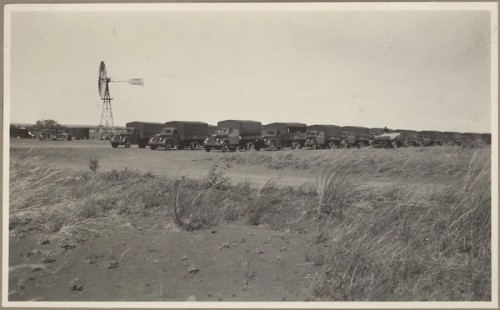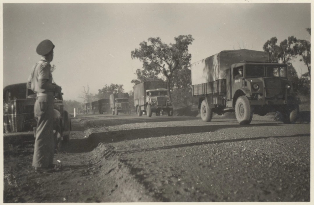 First convoy on completed road, north of Clermont, 1943. The NSW Dept of Main Roads, as constructing authority for the Allied Works Council, began work on 5 Sep 1942 and completed the road on 30 Apr 1943. It cleared 1,652 acres (668.5 hectares), built 70 concrete culverts, 104 cattle grids and 33 bridges. Over 2000 Civil Construction Corps members worked on the NSW section. This photo shows the first convoy using the completed road about four miles (6.4 km) north of Clermont.