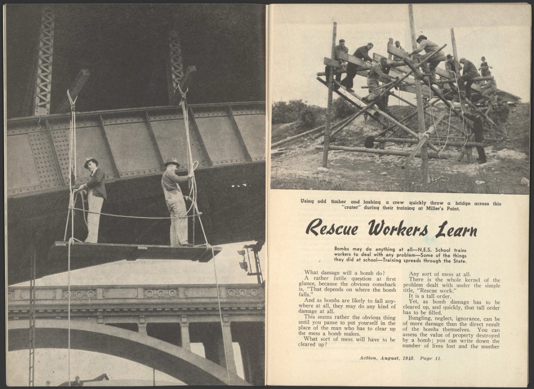 This article from the July 1942 issue of Action describes the shelling of Sydney on 8 June 1942 from the point of view of the National Emergency Services. In the aftermath of the shelling, the NES achieved their aim of quickly clearing the bomb damage and restoring services to afflicted areas.