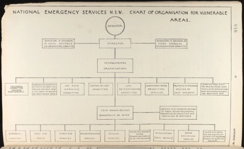 In May 1935 the Australian Government asked each State to begin making plans to protect their citizens against chemical weapons, such as poison gas bombs, carried by aircraft flying from a ship offshore. This was seen as a remote possibility but one with potentially disastrous results. The Federal Government defined the most vulnerable area in NSW as Newcastle, Sydney, Wollongong and inland to Lithgow. This area housed significant industries (including the manufacture of munitions), resources, infrastructure and population. Explosive and incendiary bombs were later added as potential threats and the State’s entire coast inland for 100 miles (161 kms) was defined as being at risk. On 1 February 1939 the plans were put into place when National Emergency Services NSW began operations.