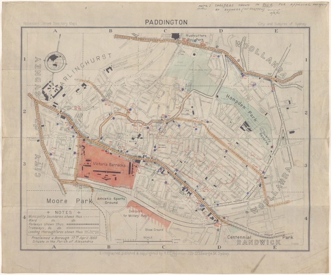 The State Government was responsible for providing air raid shelters for the travelling public from the Hunter to the Illawarra. Employers had to provide shelters for their employees and customers. The planning of air raid shelters for travellers began in Jun 1940. This map shows more than 20 Pillbox shelters (blue circles), along with trench shelters (blue zig zags). Paddington had a high density population, major bus and tram routes and (still is) the home of Victoria Barracks. Only seven pillboxes were eventually built.