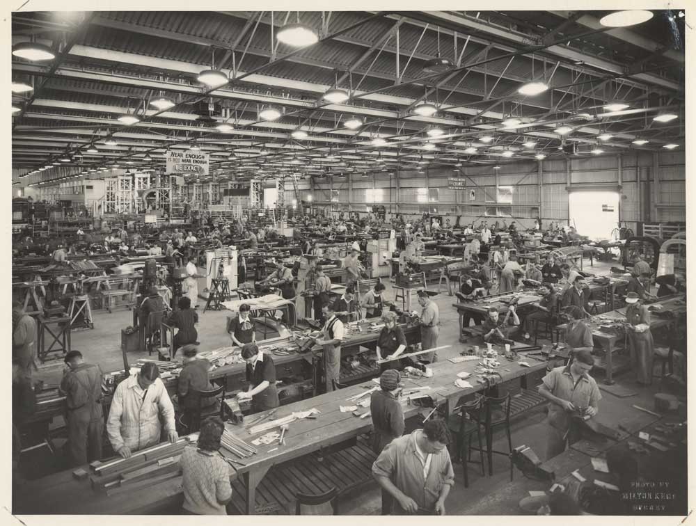 Some of the more than 2,000 male and female workers at the Dept of Aircraft Production’s factory at the Chullora Workshops, c.1943. The sign above their heads reads ‘NEAR ENOUGH IS NOT NEAR ENOUGH. BE EXACT!’ A second sign visible in other photos states ‘A CONCEALED MISTAKE IS A CRIME! IT MAY COST A BRAVE MAN HIS LIFE’. Production of the Beaufort Bomber began in 1940 and ended in April 1944. As well as the 700 Beaufort bomber sets produced and spare parts, segments of the Beaufighter and Lincoln airplanes were also constructed at Chullora.