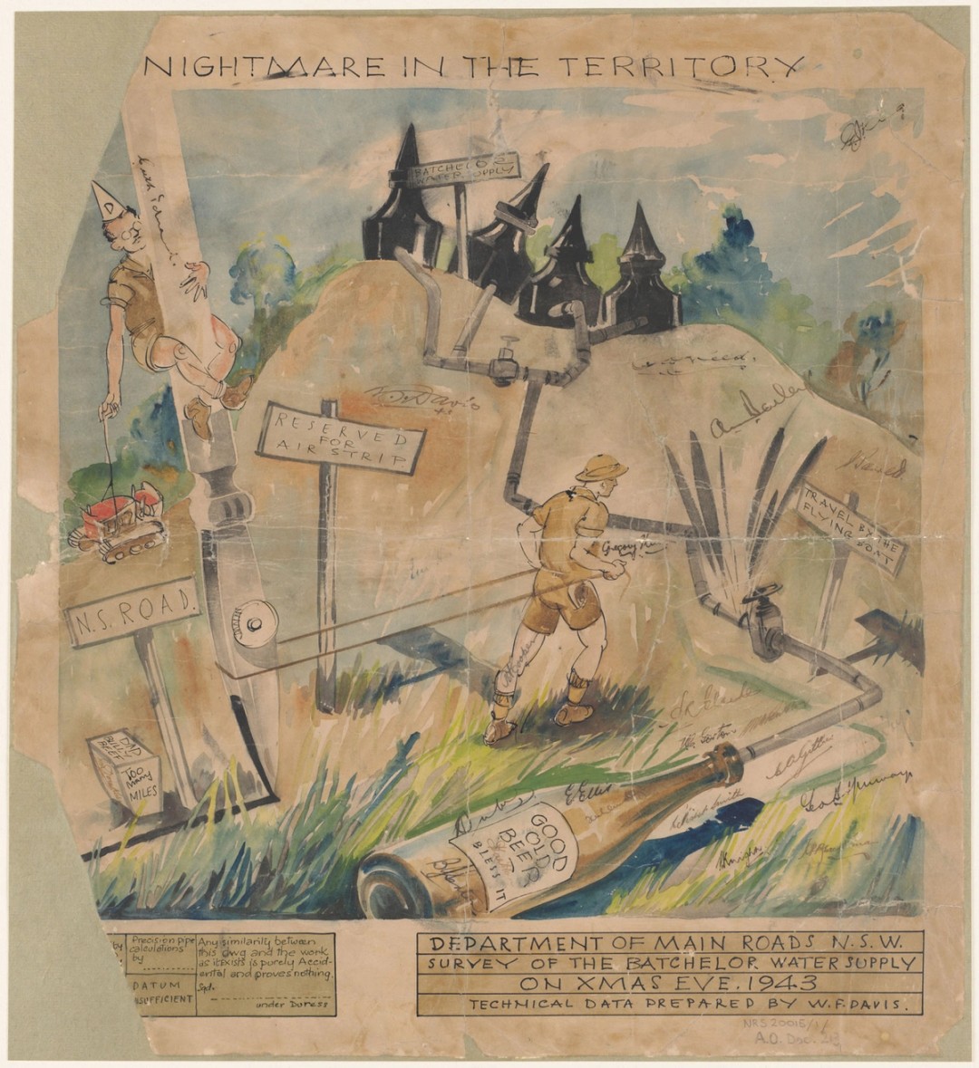 Initially, the state road authorities dealt directly with the Army. In February 1942 the Allied War Council was created and by June 1943 it was the chief co-ordinator for the Northern Territory construction work. By 1943 state and local government employees volunteering to work in the Northern Teritory were enrolled in its Civil Construction Corps. In 1943 the NSW Dept of Main Roads maintained the roads it had previously built in the Territory, tarred 168 (270 km) of road between Darwin and Katherine and built 26 miles (42 km) of access roads. In conjunction with the RAAF it constructed five airstrips at Fraser, Tindal, Riding, McDonald and Long, and set up a water supply at the Batchelor airfield which included an eight mile pipeline. Some of the men who worked on the Batchelor water supply have signed this cartoon, ‘Survey of the Batchelor Water Supply on Xmas Eve’, which was drawn by WF Davis.