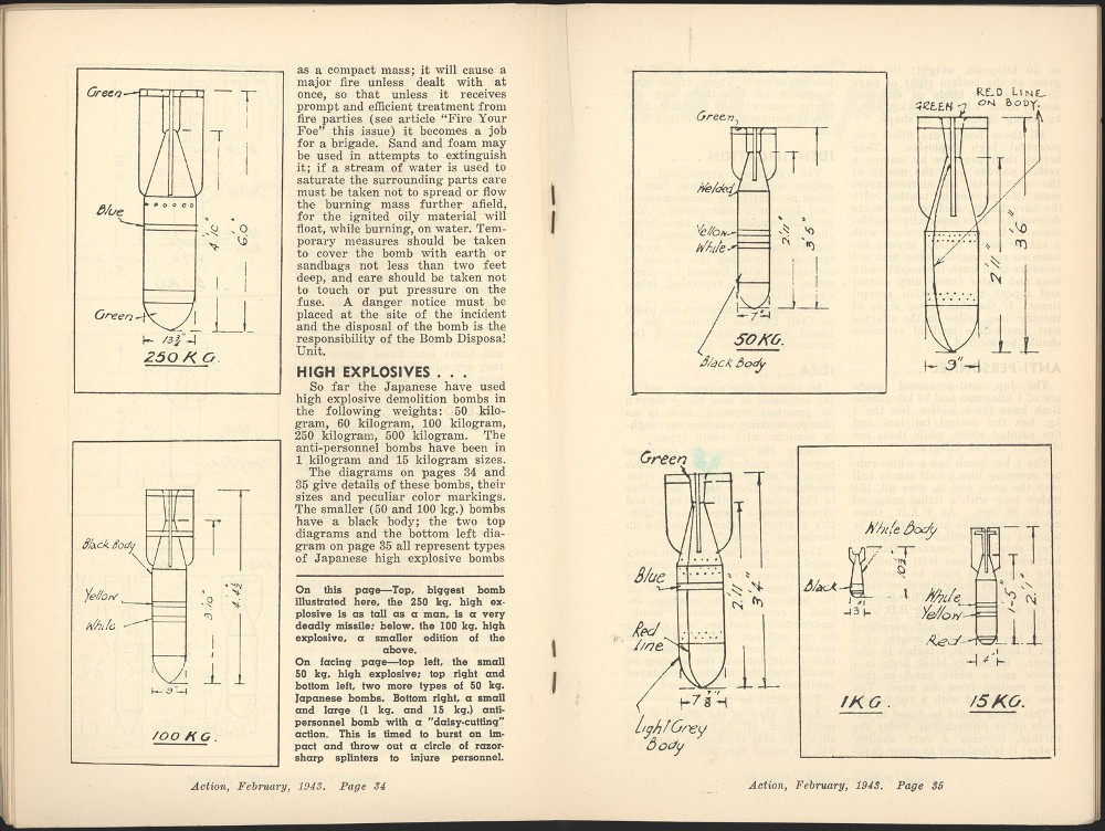 These two pages, from a four page article titled "Bombs", include diagrams of the types of bombs that the Japanese forces were known to use. It was published one year after the bombing of Darwin. 'Action: Journal of National Emergency Services NSW', Vol 2, No 5. Feb 1943, pp 34-35.