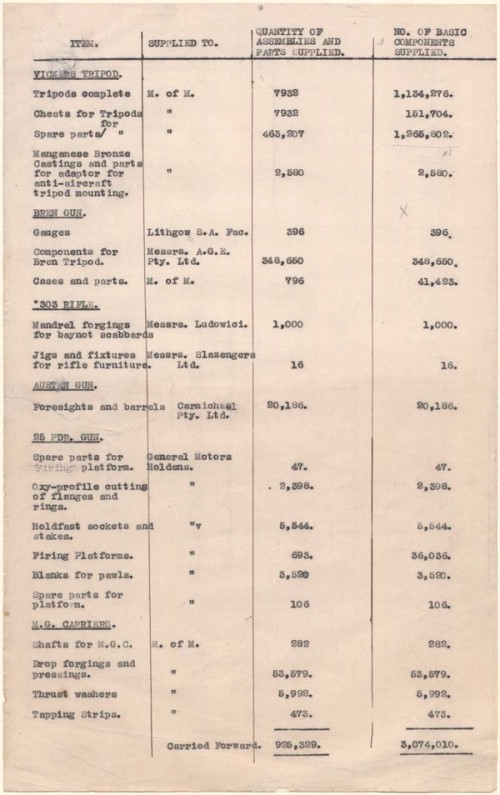 The list below is the first of two pages of munitions jobs completed at the Randwick Tramway Workshops by the Department of Road Transport and Tramways. From August 1940 Randwick built Vickers Machine Gun tripods, packaging cases, and spare parts; parts for Bren Guns, 303 rifles, Austen guns, 25 pounder guns, 3 inch anti-aircraft guns, and Lewis guns; parts for machine gun carriers, generators, and charcoal burning kilns; and assembled wheels and axles for Garratt locomotives. The list names the firms the items were made for, including the Ministry of Munitions and General Motors Holden, and thus shows the complex subcontracting that occurred during World War II.