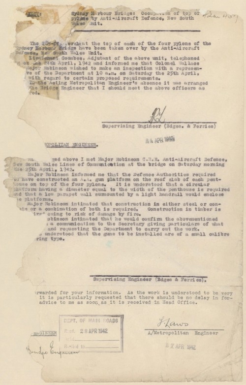 Private property and parklands were taken over by the Commonwealth for the duration of the war for a variety of war-related uses. In 1938 the pylons of the Sydney Harbour Bridge had been inspected to find the best sites for fixing machine guns. From 13-15 November 1939 the No. 5 Section, 1st Anti-Aircraft Battery (Lewis Gun Section) held training exercises in all four pylons. A memo from 25 April 1942 describes an inspection of the Bridge pylons by the Army prior to them taking over control of all four pylons and guns being erected in two of them. The pylons were also used for troop accommodation.