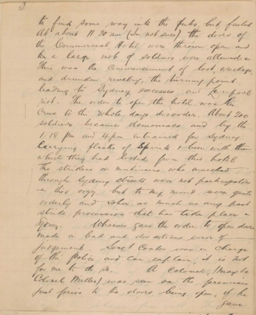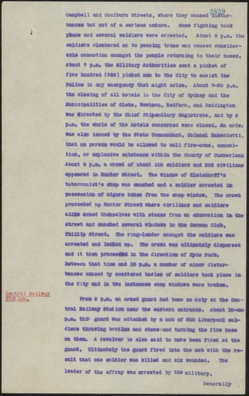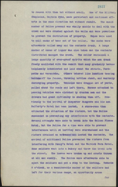 At about 11.30am (I’m not sure) the doors of the Commonwealth Hotel were thrown open and a large mob of soldiers were allowed in. This was the commencement of loot, wreckage, and drunken revelry, the turning point leading to Sydney excesses and Liverpool riot. The order to open the hotel was [the] crux to the whole days disorder. About 200 soldiers became demoniacs and by the 1.18pm and 4pm entrained for Sydney carrying flasks of spirits and beer with them which they had looted from this hotel.15