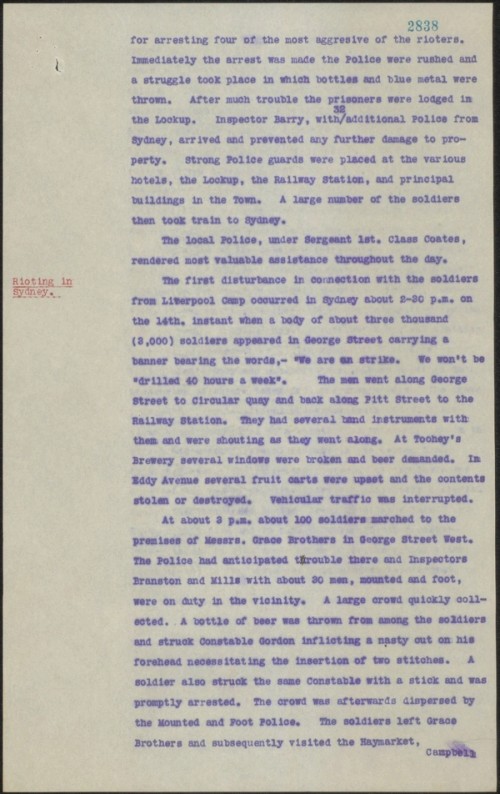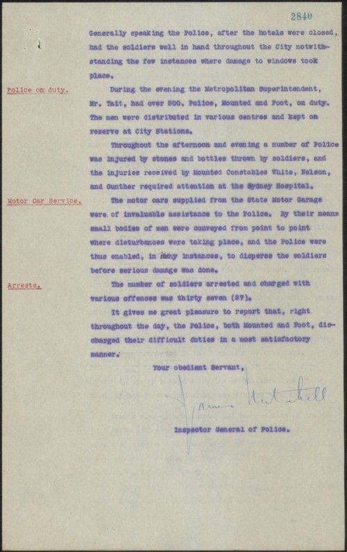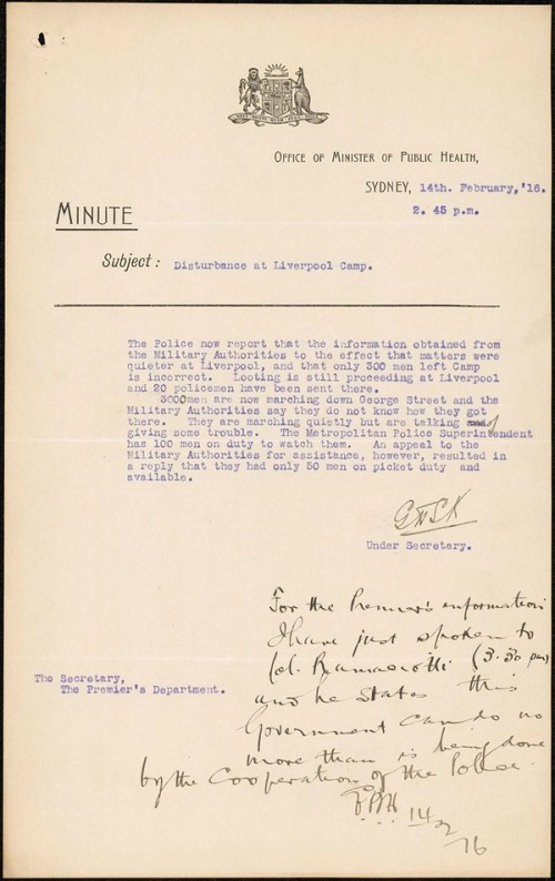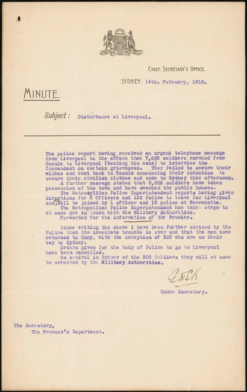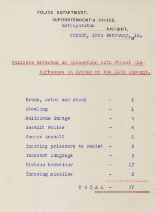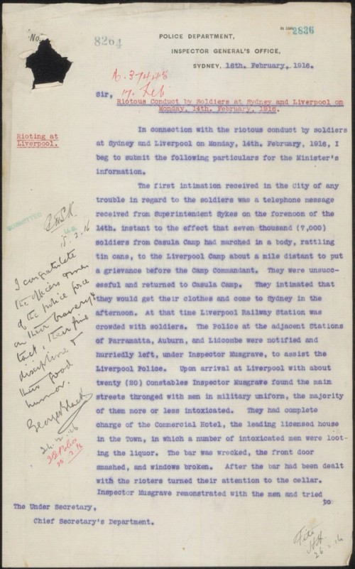 Thousands of soldiers made their way back to the Liverpool camp during the evening of 14 February and the next morning for 11am roll call. Police reports for the riot state that 37 soldiers were arrested in Sydney, with 17 charged with riotous behaviour. [Fig. 10] In the weeks that followed many faced both local court and the military courts on charges of mutiny. In the margin of the Police report on the riot [Fig. 11-15] there is a handwritten note from Chief Secretary George Black in which he congratulates “the officers and men of the police force on their bravery and tact, their fine discipline and their good humour.”26