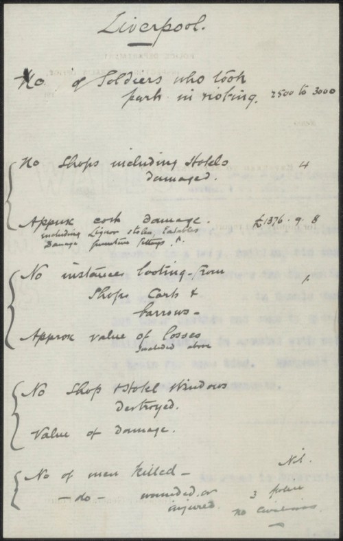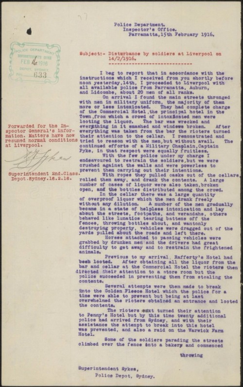 By midday there was rioting at Liverpool. An extra twenty police were sent from the nearby stations of Parramatta, Lidcombe and Auburn but by the time the police arrived, Rafferty’s Hotel and the Commercial Hotel had been looted and the streets were full of drunken soldiers. 12 These extra police officers were not sufficient to deal with the Liverpool riot which continued until after 5pm when large numbers of police reinforcements arrived.13 Police reports submitted after the riot estimated that there were about 2500-3000 soldiers involved in the riots at Liverpool, they caused an estimated £1376 worth of damage and three police officers were injured.14 [Fig. 4] An eyewitness account of the riot at Liverpool survives in a letter to Premier WA Holman from Liverpool resident, Mr A Jones of Junction Street. [Fig.5] In his letter Jones describes the events of the day: