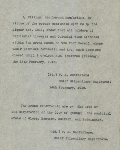By 5pm a combined civil and military police picket was established at various points throughout the City, including Central Railway Station. Some 500 extra police had been drafted from suburban police stations and the military authorities had offered up to 1500 extra men.21 Premier Holman was kept up to date with the riot and called an urgent cabinet meeting to discuss the situation. Cabinet agreed to close hotels in the districts of Sydney Central Business District, Glebe, Newtown, Redfern and Paddington. [Fig. 9] State motor cars were also made available to Police to enable them to move quickly around the city.22