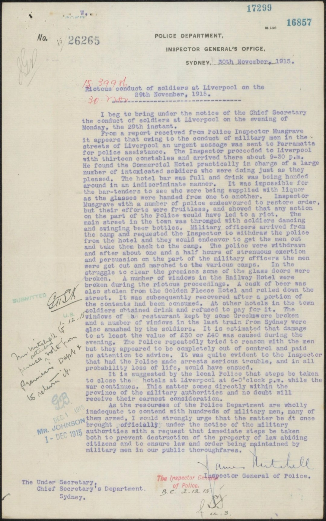 Two small riots broke out as protests about the conditions of the camp. On 26 November 1915 soldiers clashed with sentries when they tried to leave camp without leave passes. Three days later, on 29 November, there was more trouble in the township of Liverpool when 1000 soldiers took over several hotels. [Fig. 1] When Police Inspector Musgrave arrived at Liverpool to deal with the crisis, he