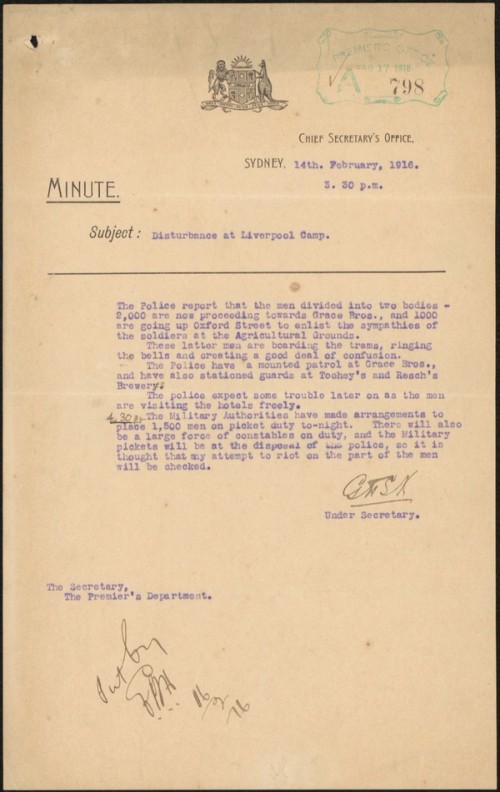 NSWSA: Premier’s Department; NRS 12060 Letters received, [9/4715] letter A16/798, Minute 18 Feb 1916.