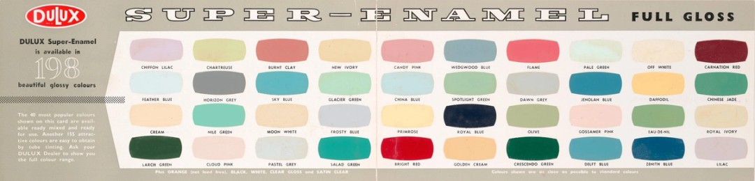 Paint charts from the late 1800s show a limited range of colours, predominantly shades of green and earthy tones such as drab (a dull light brown), buff and brown. At the turn of the 20th century, colours remained muted, with pastels – soft greens, yellows and pinks – becoming increasingly popular.